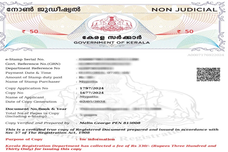 Kerala Certified Copy contains important information which can help in Verify Ownership, Buy or Sell Property, Apply for Loans or Mortgages, Legal Disputes/Litigations, and Transaction History. In Certified Copy you will find:- Document Number and Registration Date: Unique record ID and date.
