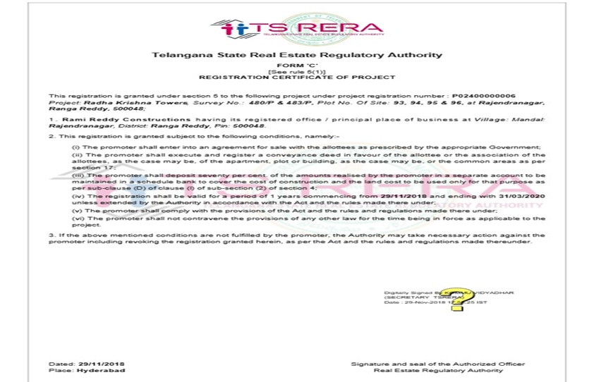 The RERA Certificate in Telangana (also known as Telangana RERA registration or TSRERA certificate) is an official document issued by the Telangana Real Estate Regulatory Authority (TSRERA). It confirms that a real estate project is officially registered with TSRERA, ensuring that the developer complies with all legal, technical, and financial requirements. You can easily check RERA registration number, or verify RERA certificate online through mypatta.